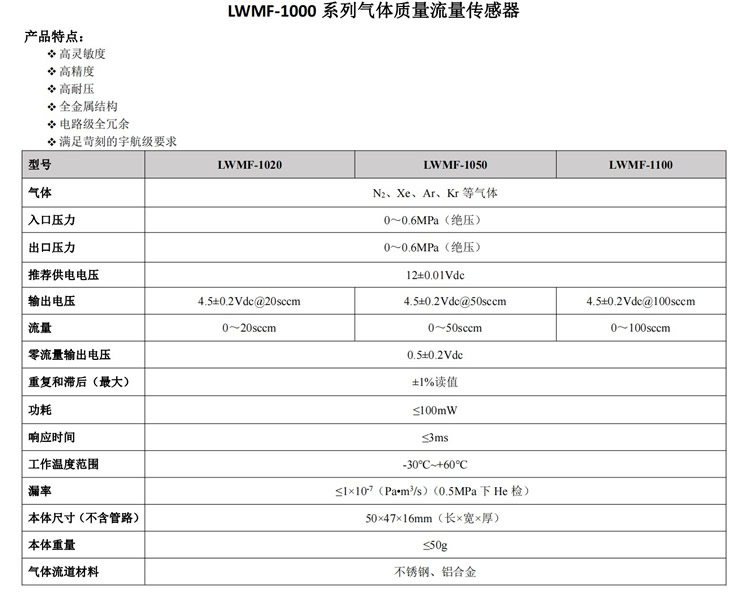 LWMF-1000系列氣體微流量傳感器是上海朗望科技研制的一款基于先進(jìn)MEMS技術(shù)的氣體質(zhì)量流量傳感器。傳感器采用鋁合金+不銹鋼結(jié)構(gòu),氣體管路采用不銹鋼材質(zhì),便于氣體管路焊接,特別適合于微流量、低漏率、高氣壓要求應(yīng)用場景。電子電路采用器件級全冗余設(shè)計(jì),滿足苛刻的宇航級使用環(huán)境要求。 產(chǎn)品主要參數(shù)