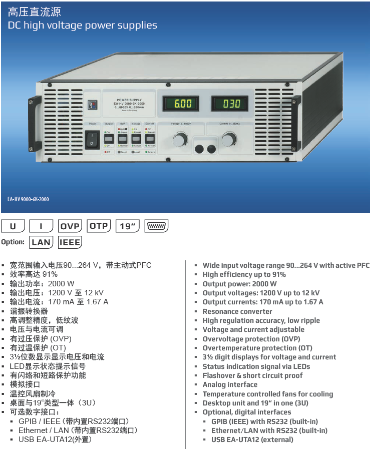 德國(guó)EA可編程直流電源HV 9000系列是一款高壓輸出型可編程直流電源,最高輸出電壓可達(dá)12kV,最大輸出功率2000W。